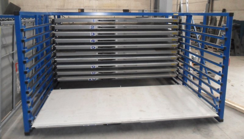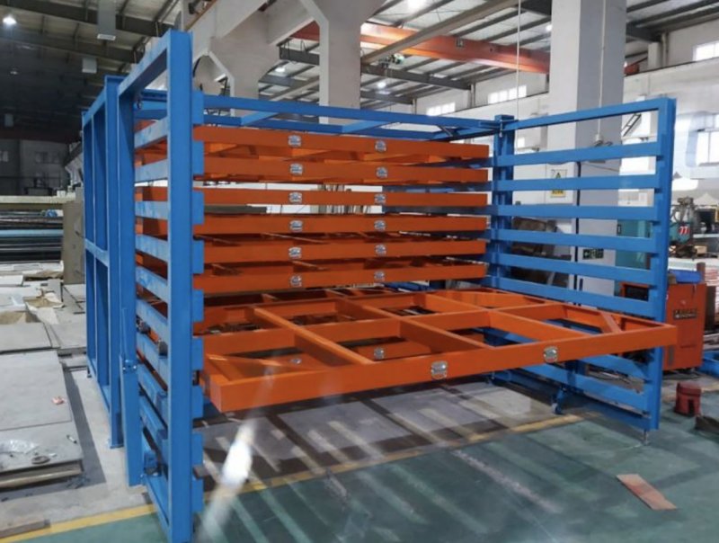 大型板材存放貨架帶有自動移動框的移動式貨架緊湊,方便定位金屬板位置,移動框架帶有滑輪和搖臂,選好目標板材之后移動懸臂即可創造空間獲取板材。移動框架固定在兩條平行軌道上,通過移動框架,人員方可進入空擋獲取金屬板是一種簡單安全的搬運方法。